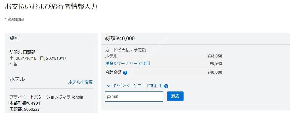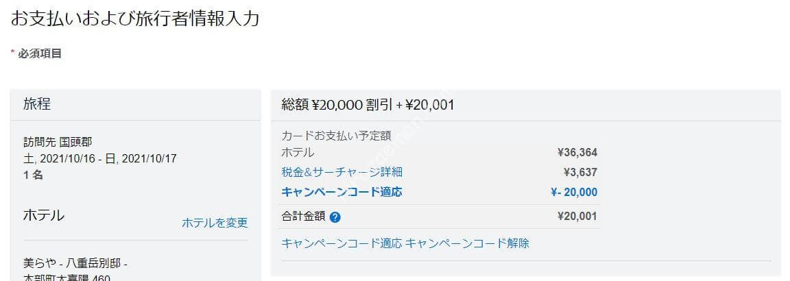 1泊10,000円程の宿泊施設を4泊した場合もキャンペーンコードを入力することで20,000円が割り引かれます。
