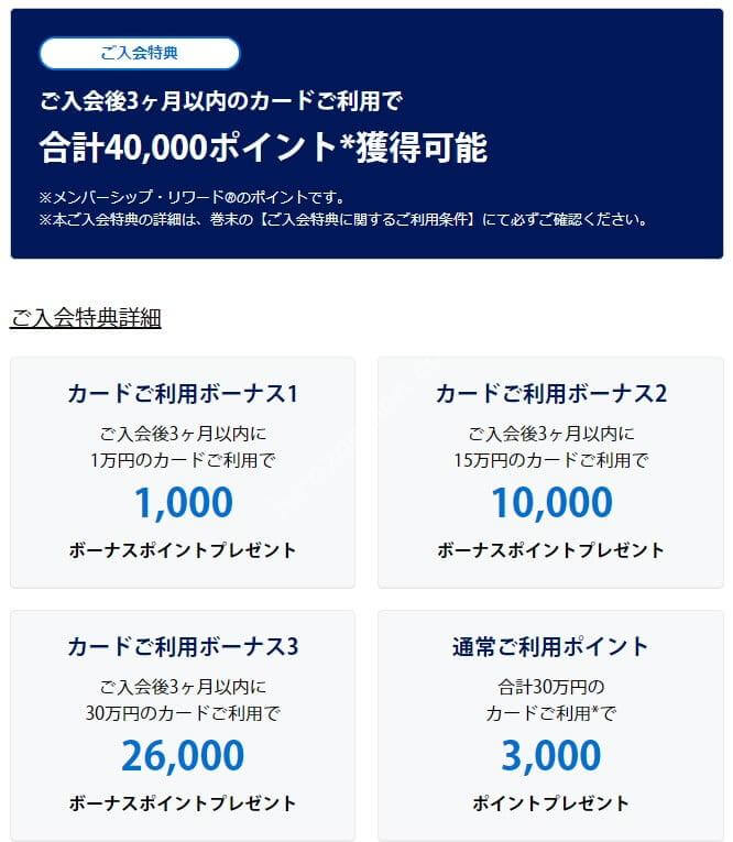 入会後3ヶ月以内のカードご利用で最大40,000ポイント獲得可能
