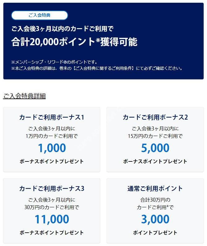入会後3ヶ月以内のカード利用で最大20,000ポイント獲得可能