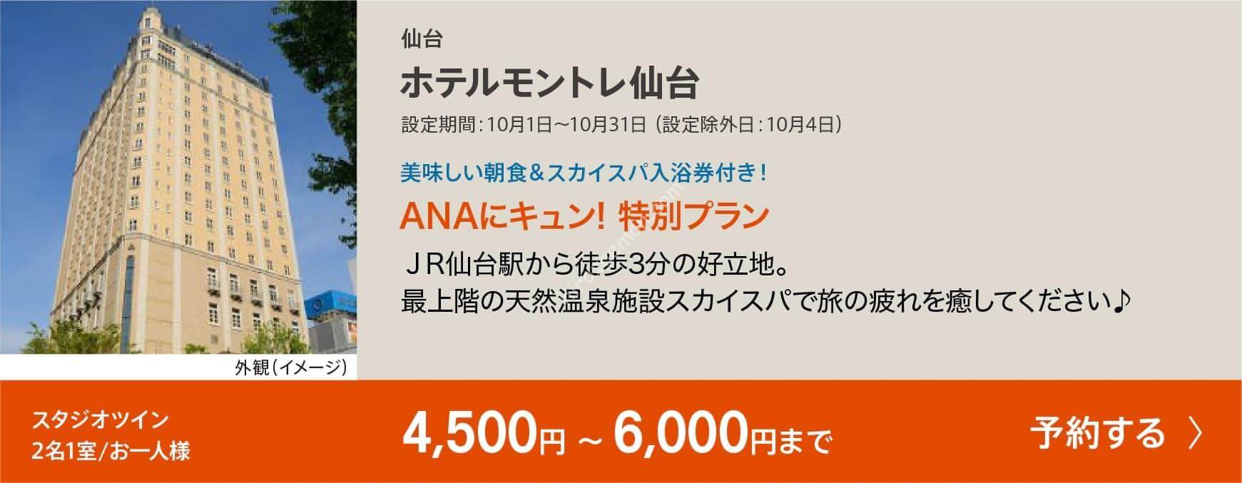 仙台のホテルモントレは朝食と最上階の天然温泉入浴券が付いて1名あたり4,500円からです。