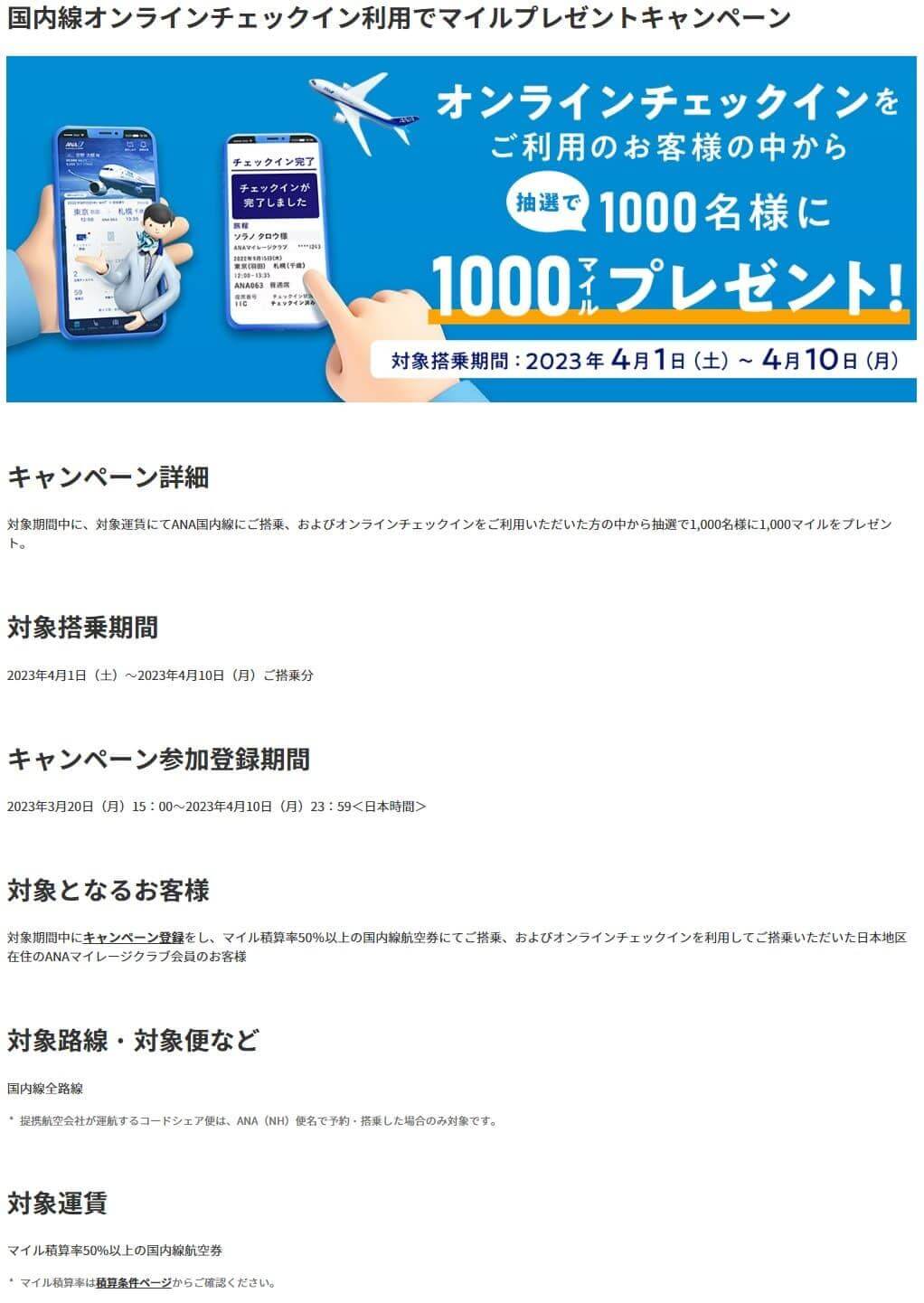対象期間中、対象運賃でANA国内線に搭乗、およびオンラインチェックイン利用すると抽選で1,000名に1,000マイルがプレゼントされます。