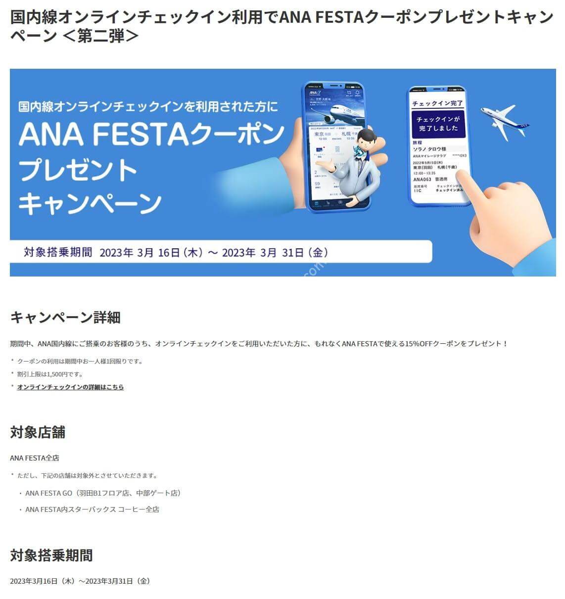 期間中、ANA国内線に登場し、オンラインチェックインを利用すると、もれなくANA FESTAで使える15%OFFクーポンがプレゼントされます。