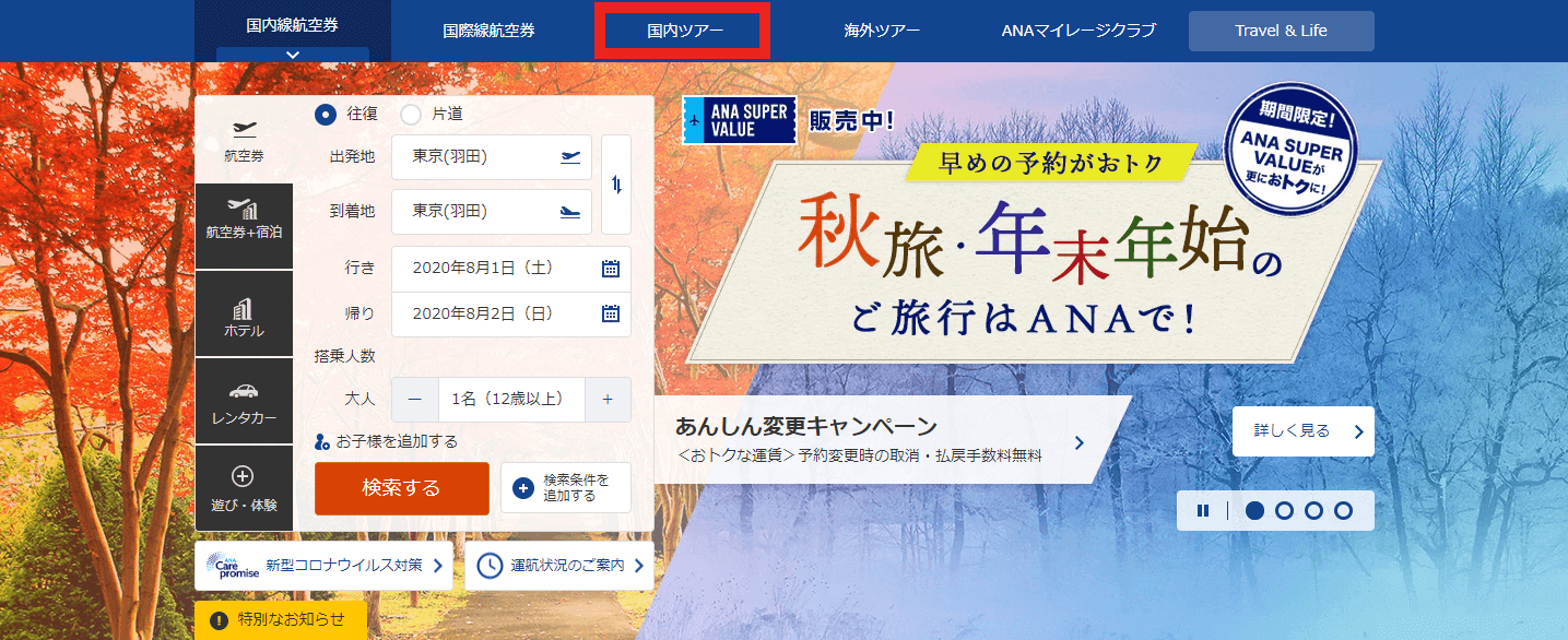 8月1日 10時よりANAからダイナミックパッケージの”Go To トラベル”対応商品がオンラインで販売開始されました。