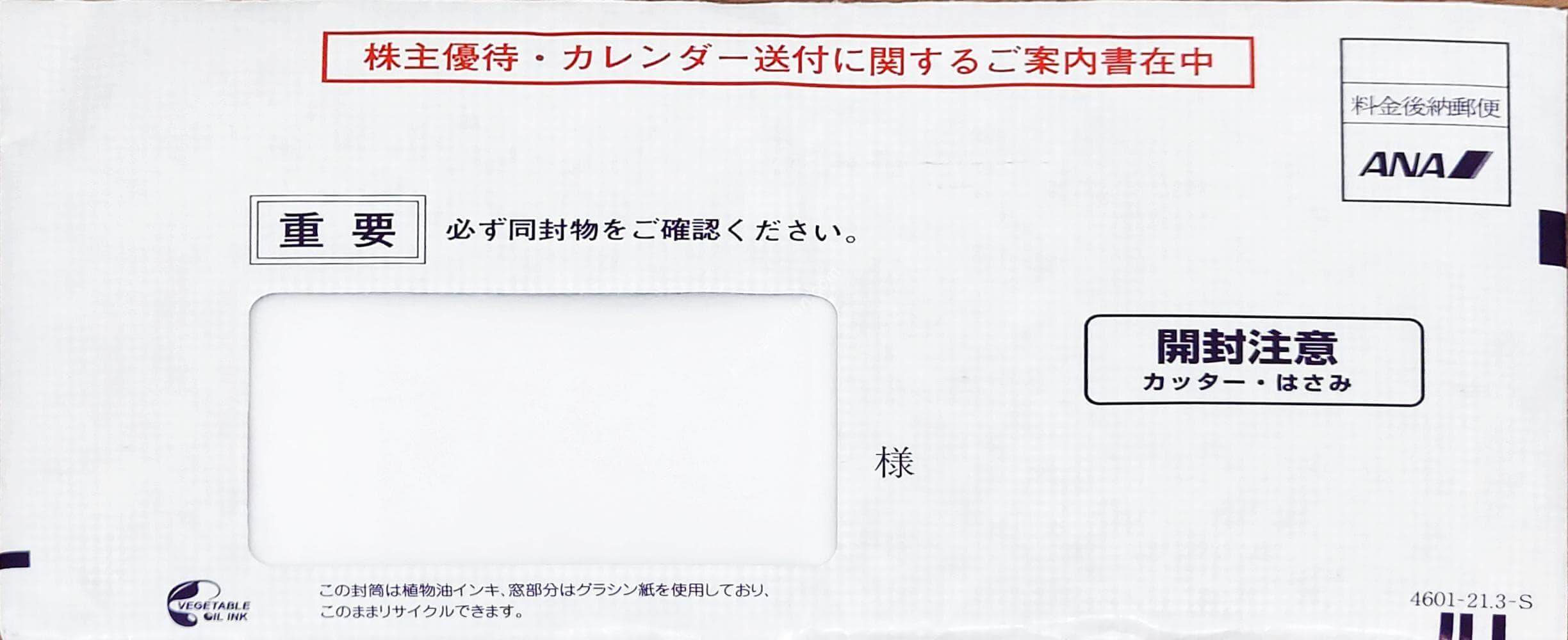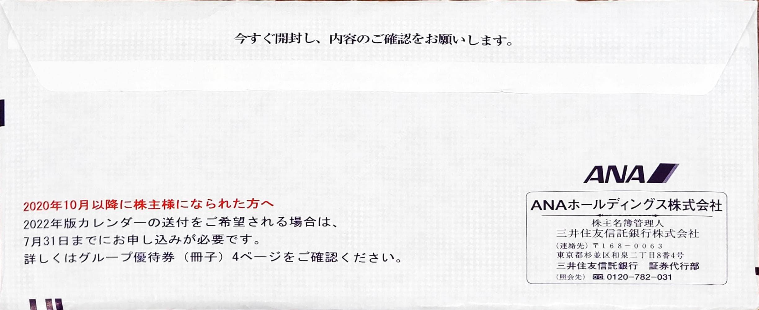 2020年10月以降新規に株主になった場合、カレンダーの送付は希望制のため、希望者は毎年5月に送付される「ANA グループ優待券」に記載のカレンダー種別変更期間中に別途手続きが必要です。