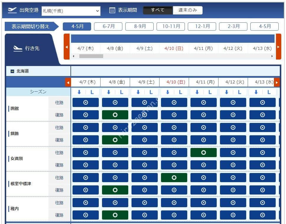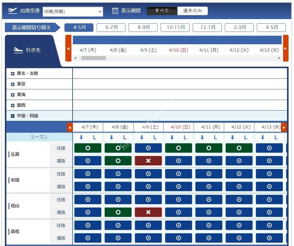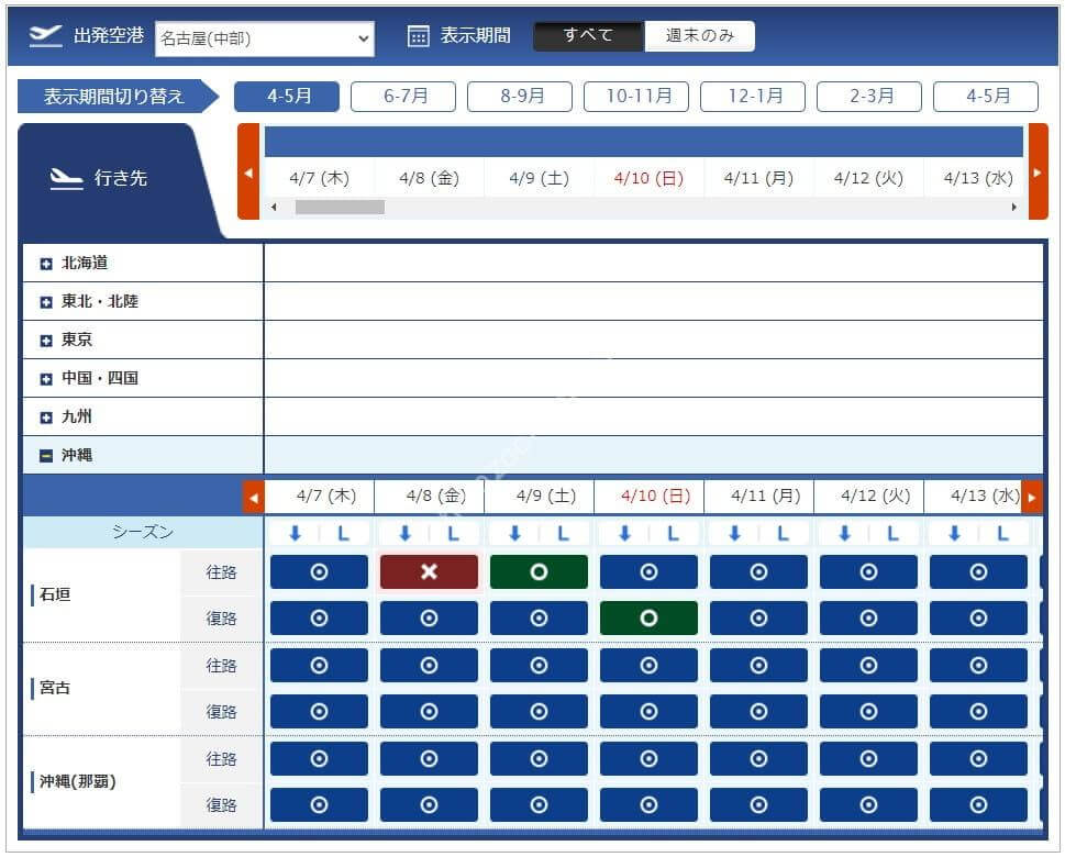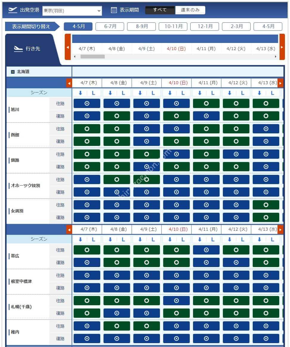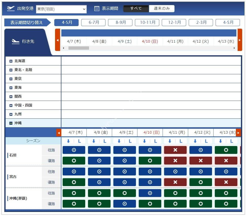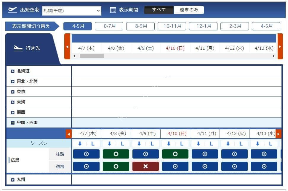 3月11日からレギュラーシーズンに移行したため必要マイル数が増えています。今週必要になるマイル数は4,500、6,000、7,500、8,500マイルです。羽田からは路線が減り、那覇と宮古はあるものの北海道や東北方面はありませんでした。中部、伊丹からは千歳も那覇もあるため旅行を考えている方には嬉しい設定です。