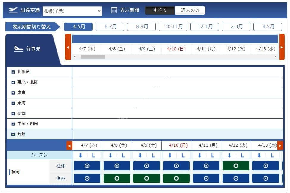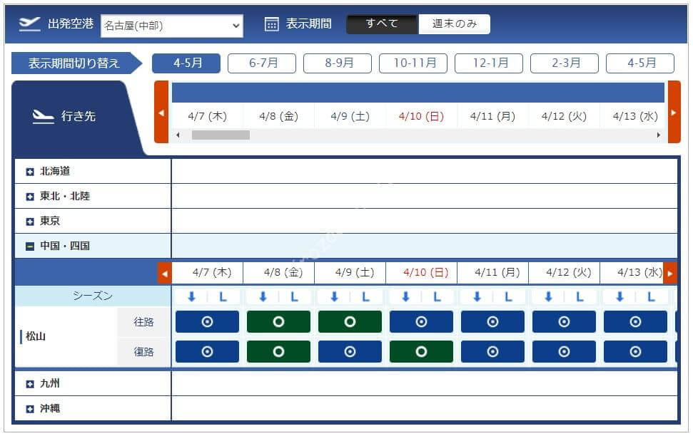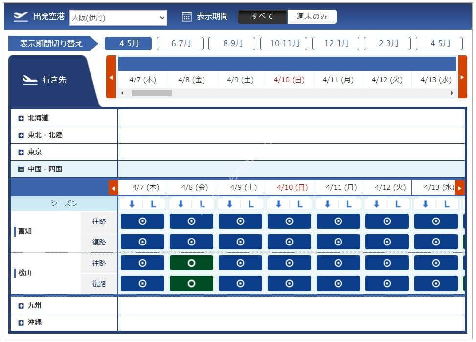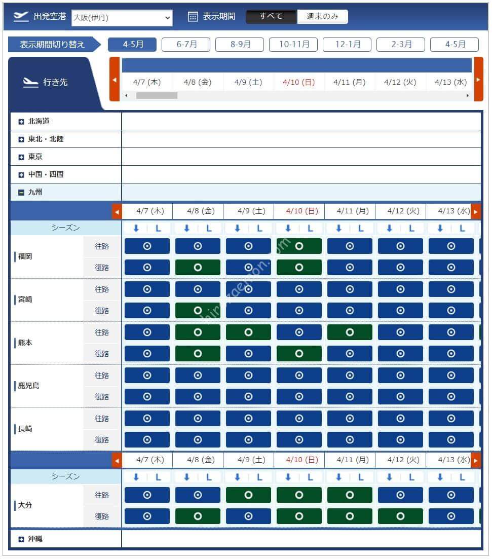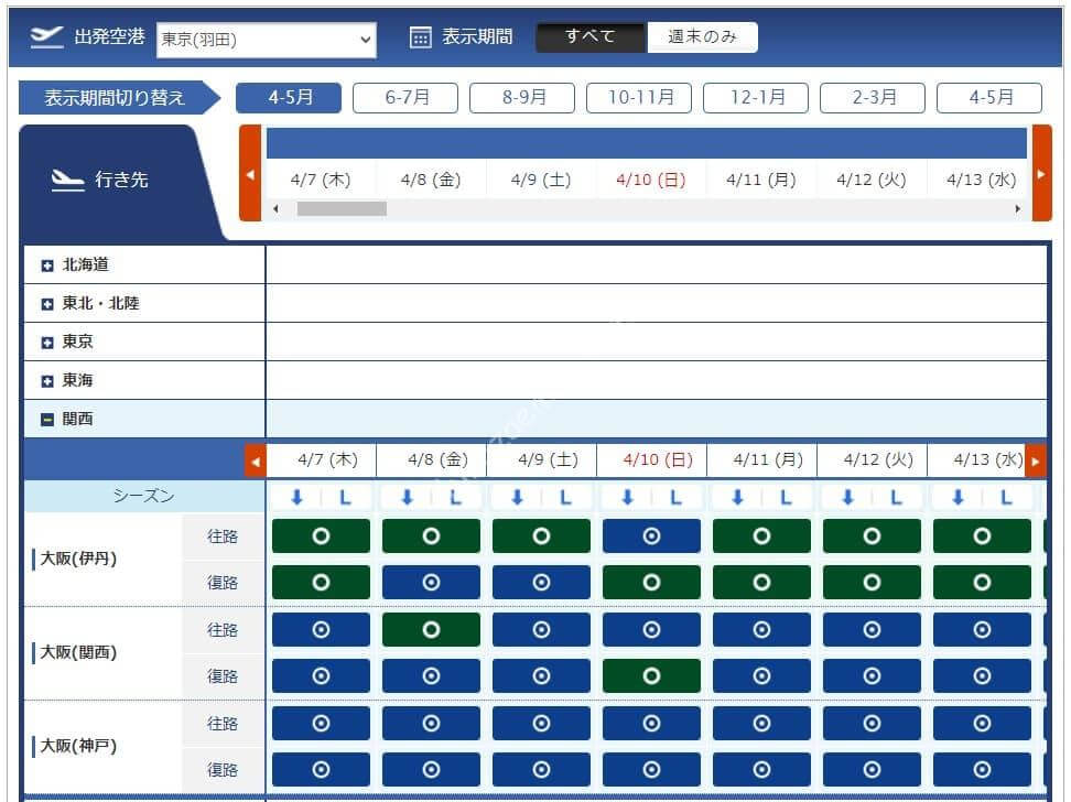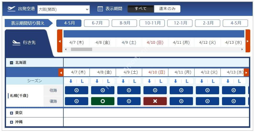 3月11日からレギュラーシーズンに移行したため必要マイル数が増えています。今週必要になるマイル数は4,500、6,000、7,500、8,500マイルです。羽田からは路線が減り、那覇と宮古はあるものの北海道や東北方面はありませんでした。中部、伊丹からは千歳も那覇もあるため旅行を考えている方には嬉しい設定です。