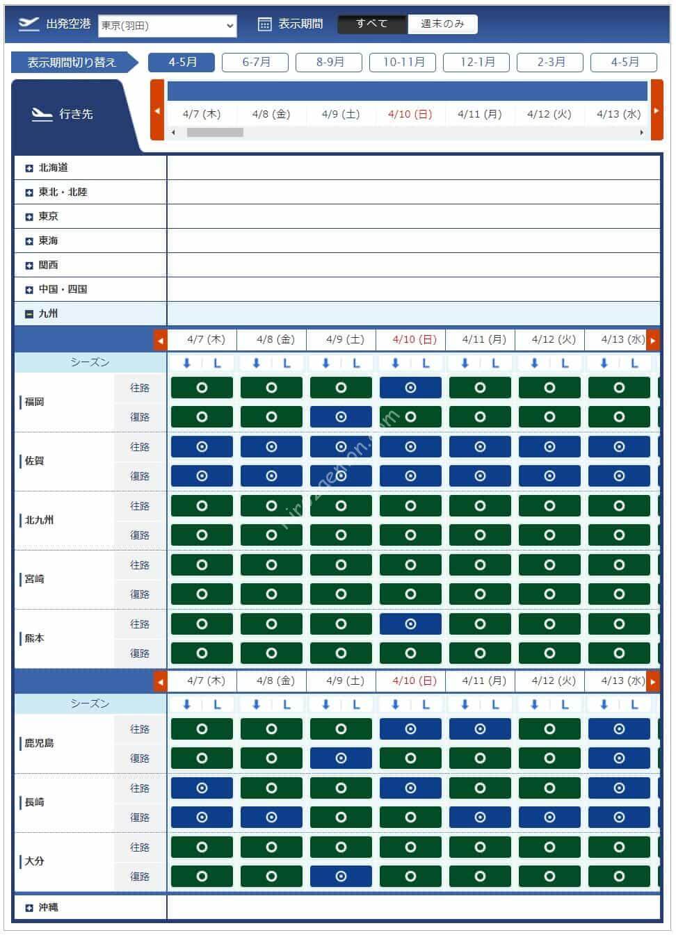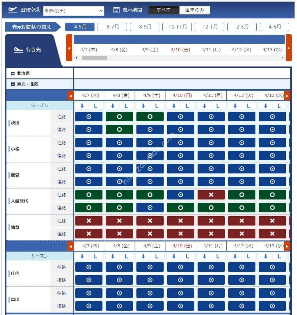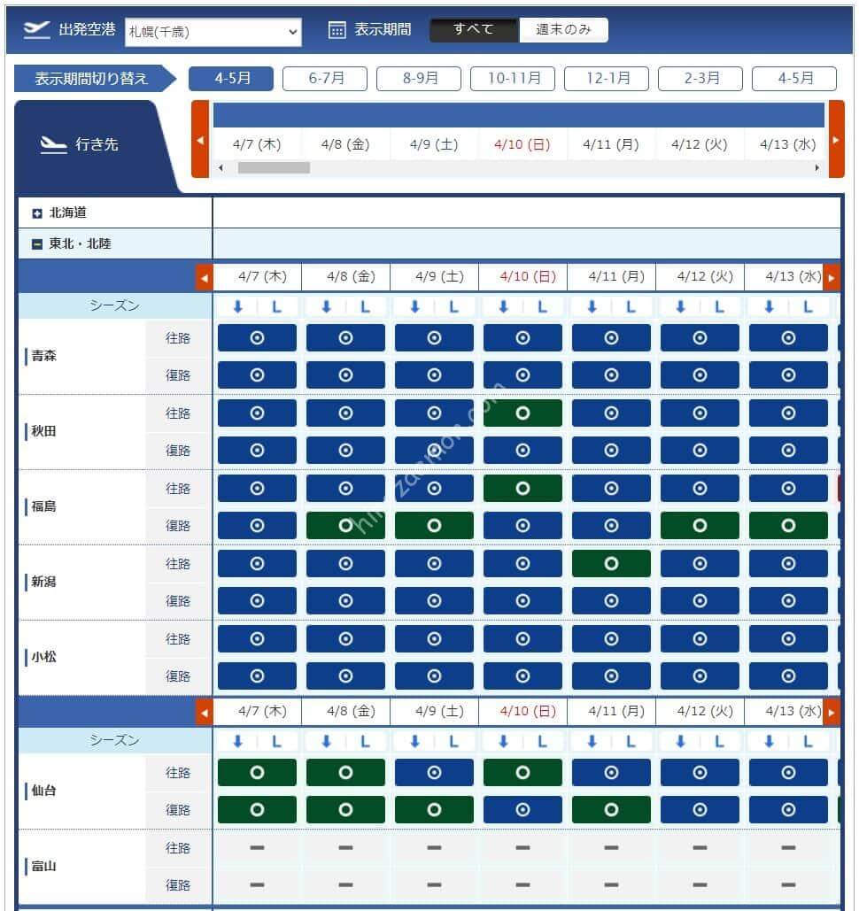 3月11日からレギュラーシーズンに移行するため必要マイル数が増えています。必要なマイル数は4,500、6,000、7,500、8,500マイルと多くなっています。羽田からは沖縄方面が石垣のみで8,500マイルが必要なためお得感が薄い週になっています。全体的にも北海道や沖縄が少ないため寂しい印象を受けます。