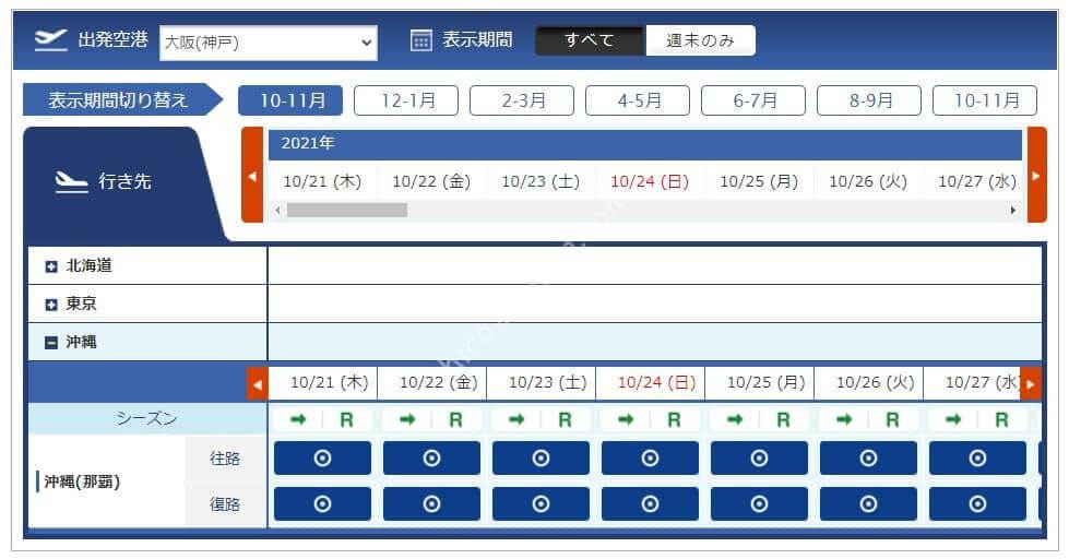 那覇は6,000マイルで羽田、中部から、4,500マイルで関西、神戸からの設定があり、レギュラーシーズンのためお得感があります。