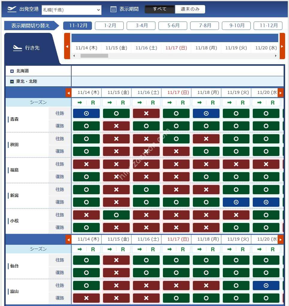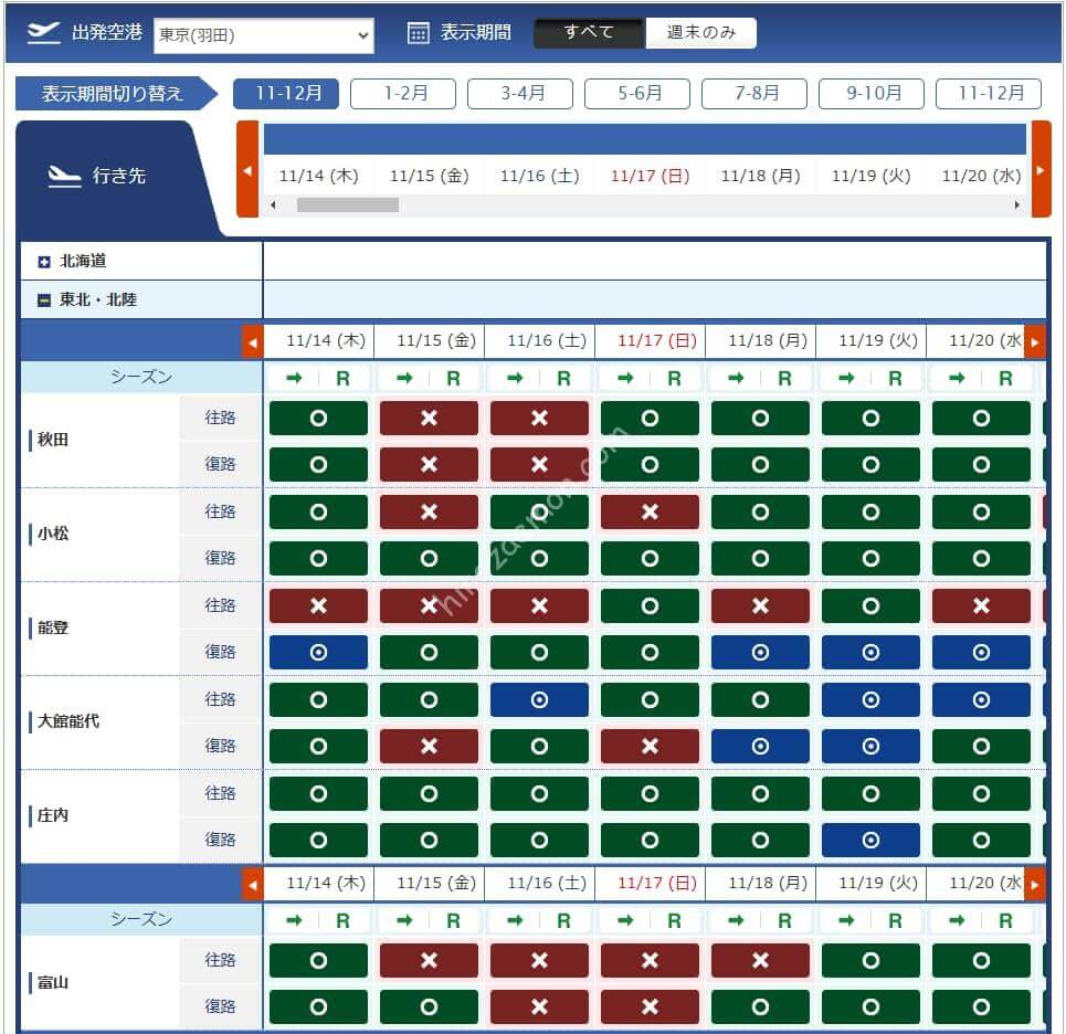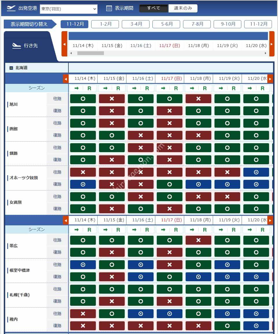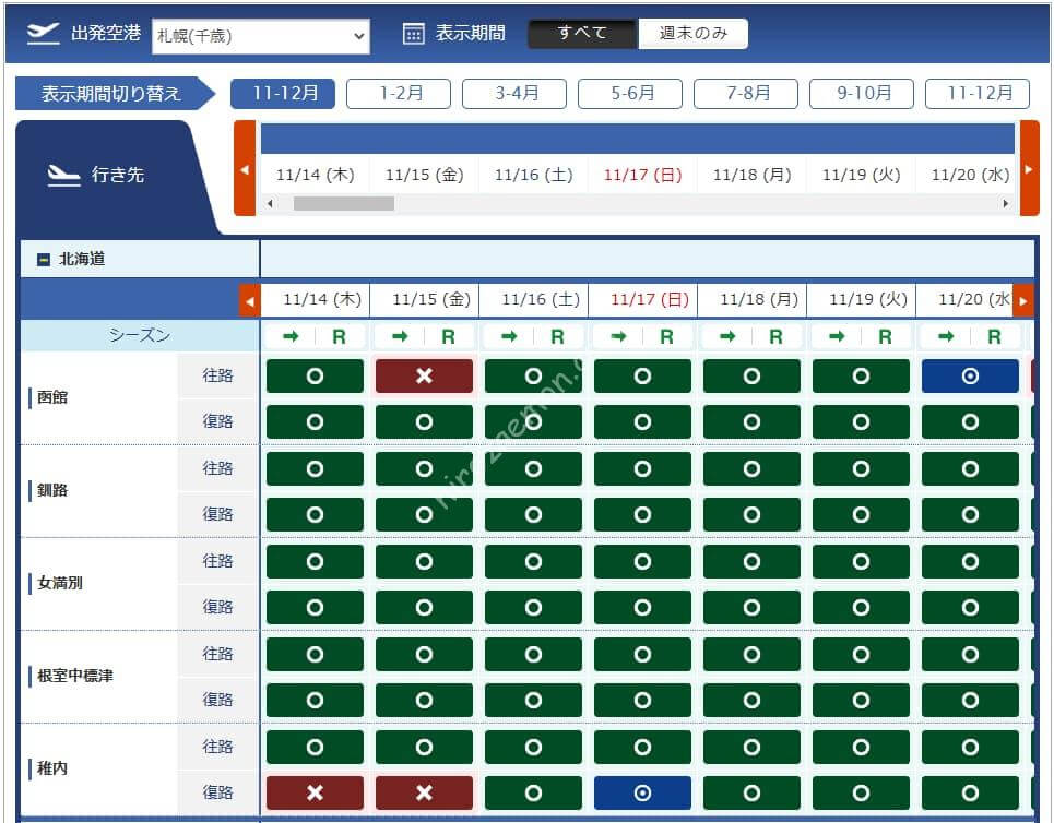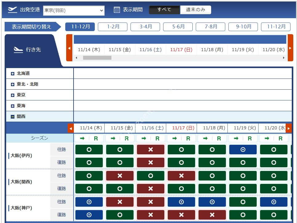 前回の11月12日発表分では3,500マイルで行ける羽田から小松や中部、神戸、5,500マイルで行ける伊丹から那覇や関西から千歳、6,500マイルで行ける羽田、静岡、中部から那覇などがありました。