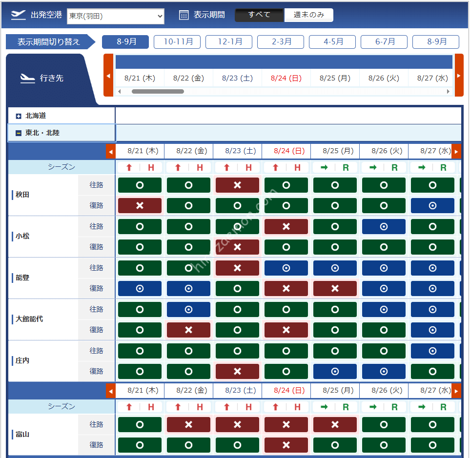 前回の8月5日発表分では6,000マイルで行ける羽田から富山、能登、小松や石垣から宮古、7,500マイルで行ける羽田から稚内、福岡、9,000マイルで行ける千歳から福岡などがありました。