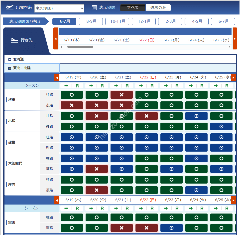 今週分のおすすめは3,500マイルで行ける羽田から富山、小松、那覇から石垣、5,500マイルで行ける羽田から千歳や関西から那覇、6,500マイルで行ける静岡から那覇などです。