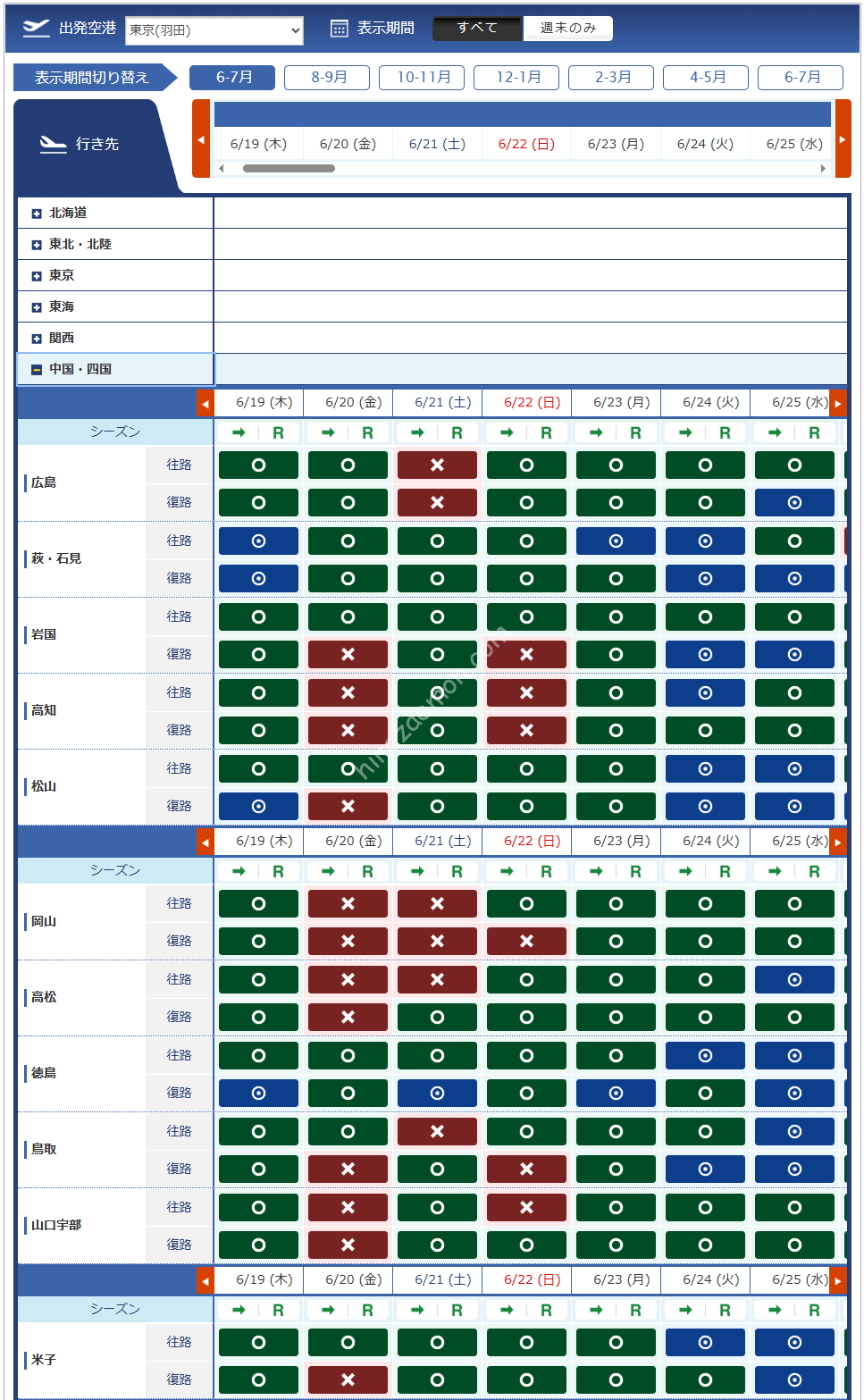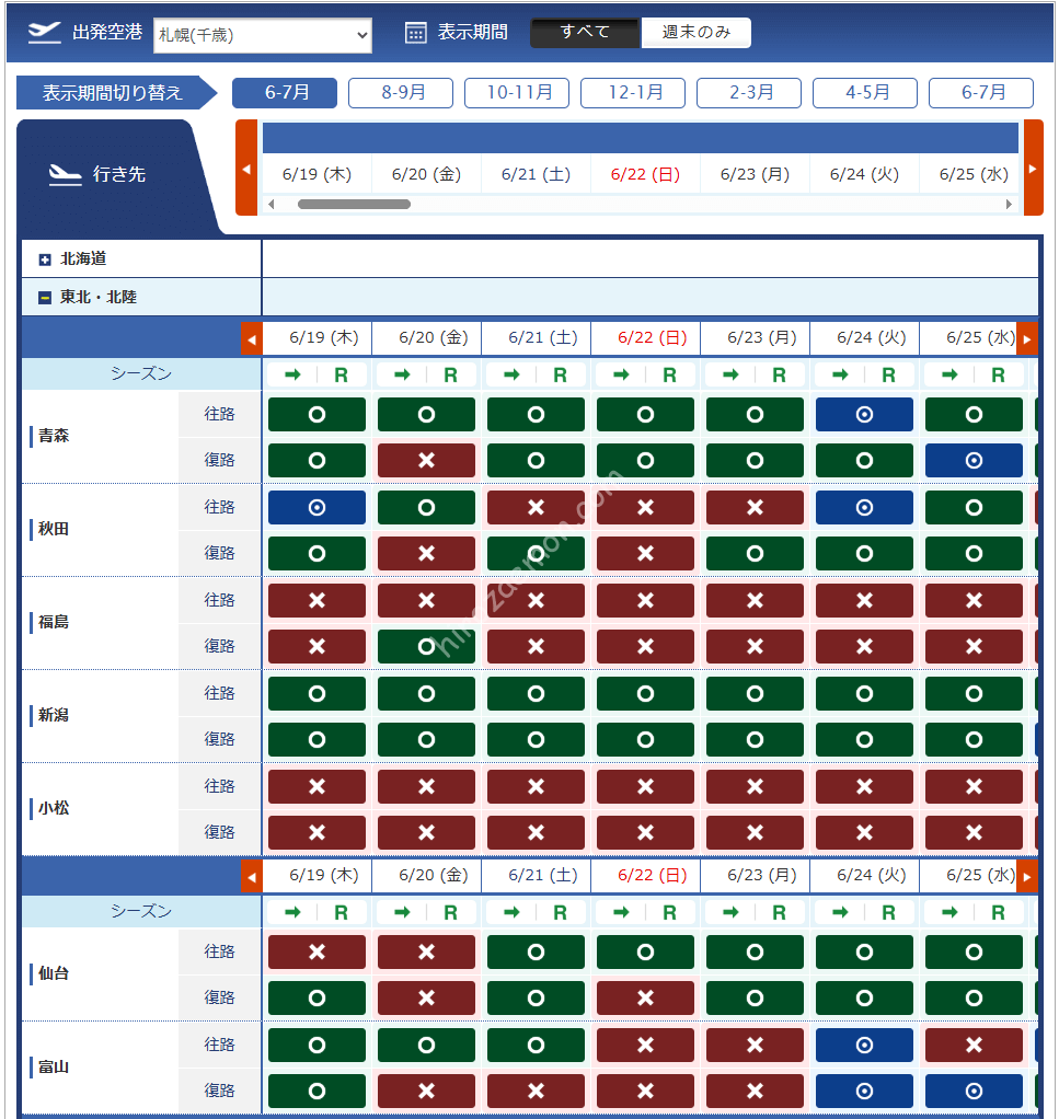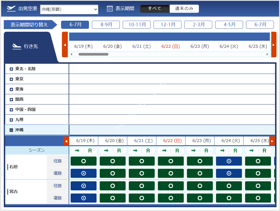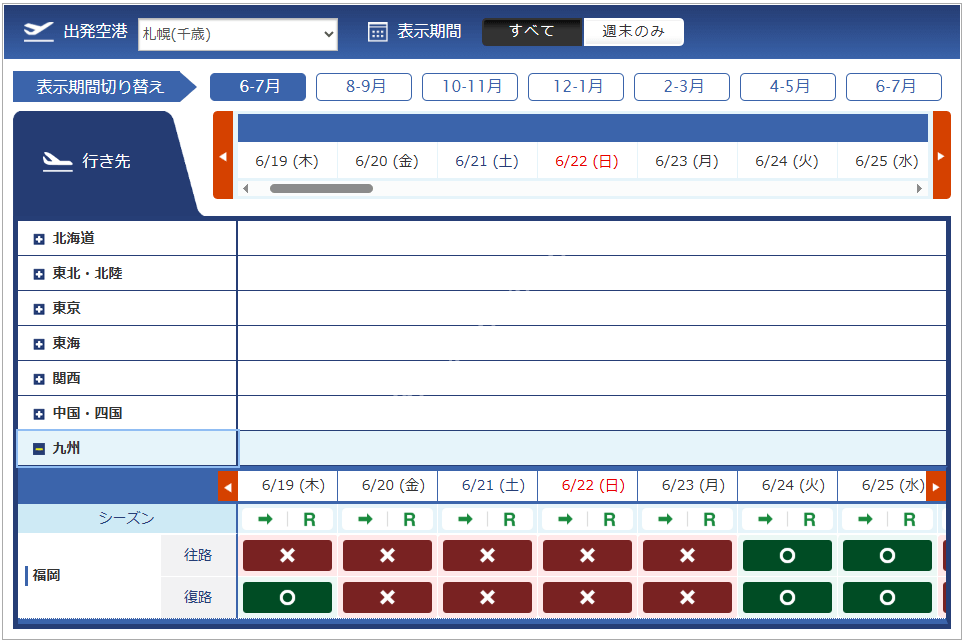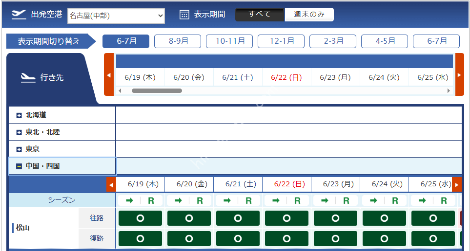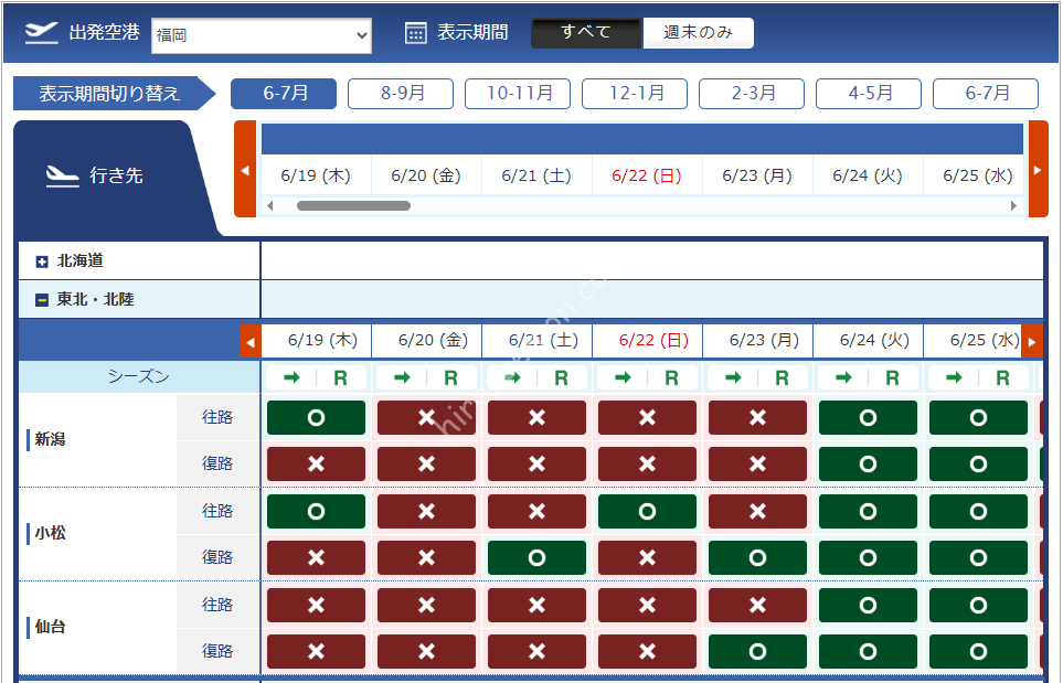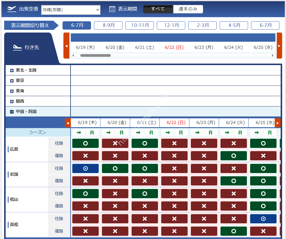 今週分で那覇が設定されている路線は仙台、松山、岩国、福岡です。