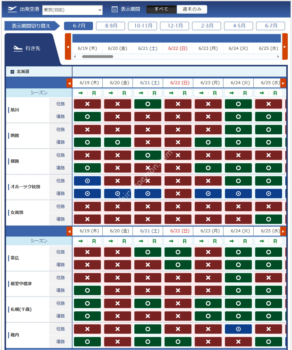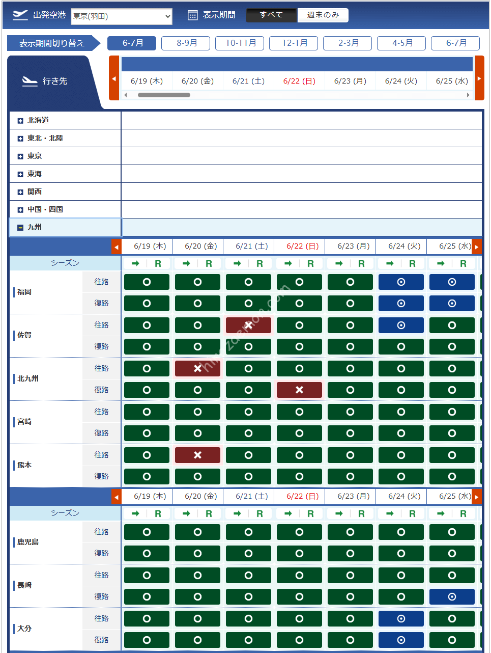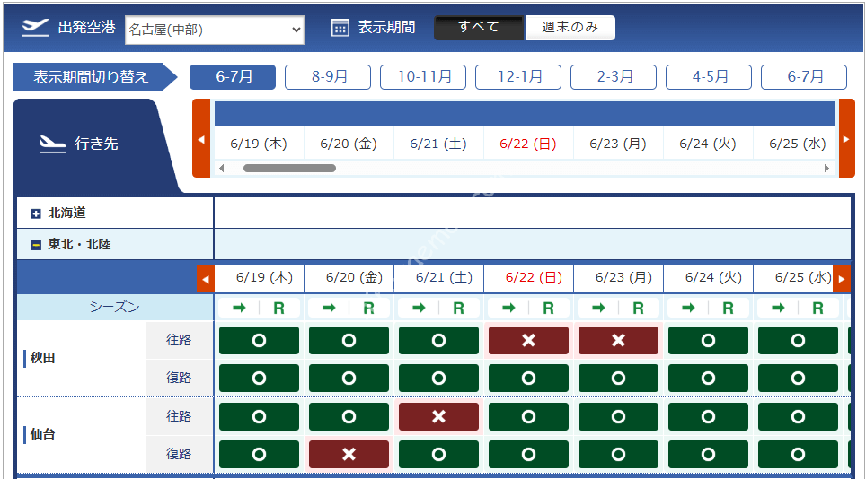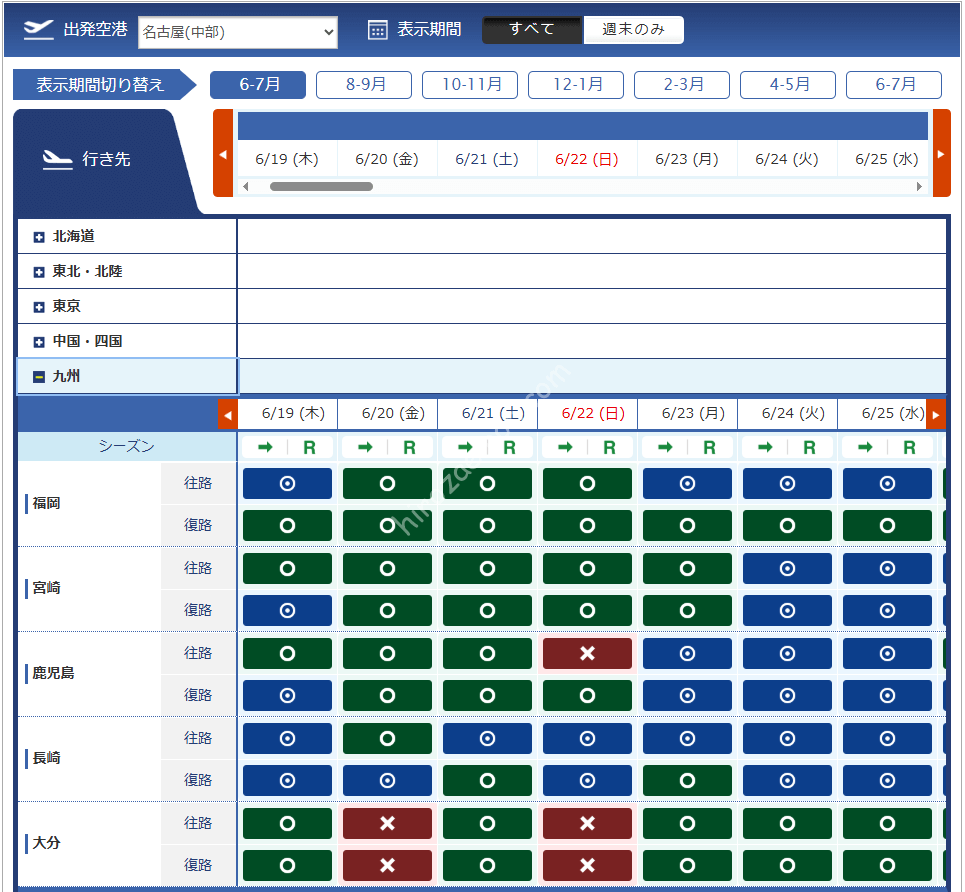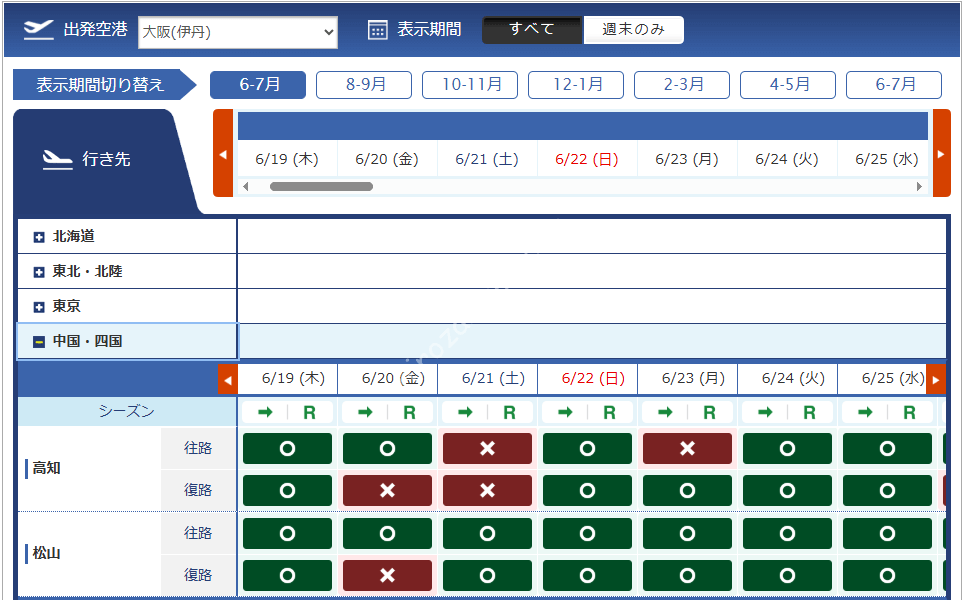 今週分で那覇が設定されている路線は仙台、松山、岩国、福岡です。