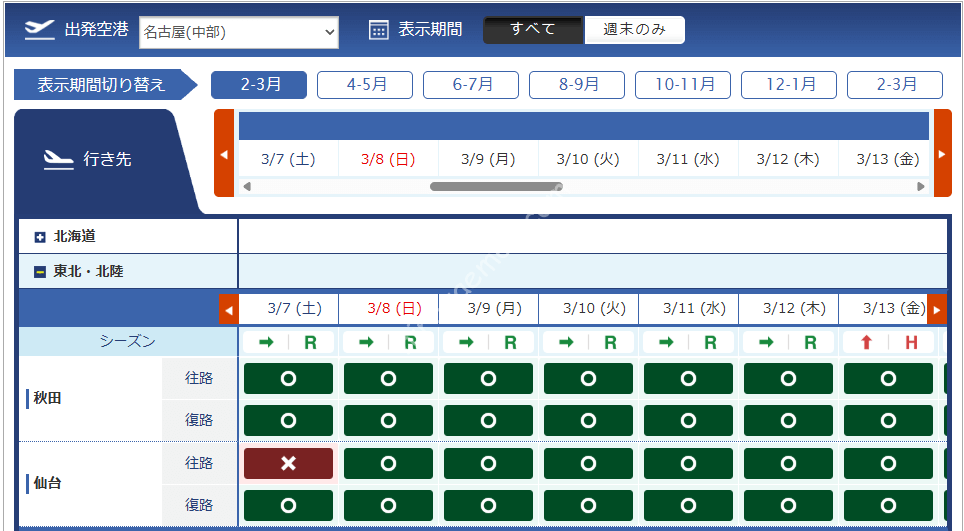 | 羽田 | 秋田 | 千歳 | 宮古 |