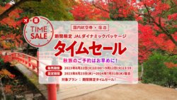 「JALパック」「ジェイトリップ(J-TRIP)」ではJALの国内航空券タイムセールと連動した2日間限定のタイムセールを実施します。「ジェイトリップ」では東京⇒石垣が60,700円OFFなど割引額が大きいためタイムセール期間中の予約がお得です。秋の連休や年末年始が対象の最大30,000円引きクーポンも配布中です。