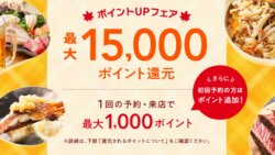 最大15,000ポイントが還元される「ポイントUPフェア」では、ディナータイムの予約で最大1,700ポイント、ランチタイムが520ポイント、期間中合計で15,000ポイントが還元されます。秋の味覚を堪能できる嬉しいキャンペーンです。この記事では他にもお得なキャンペーン情報等を掲載しています。